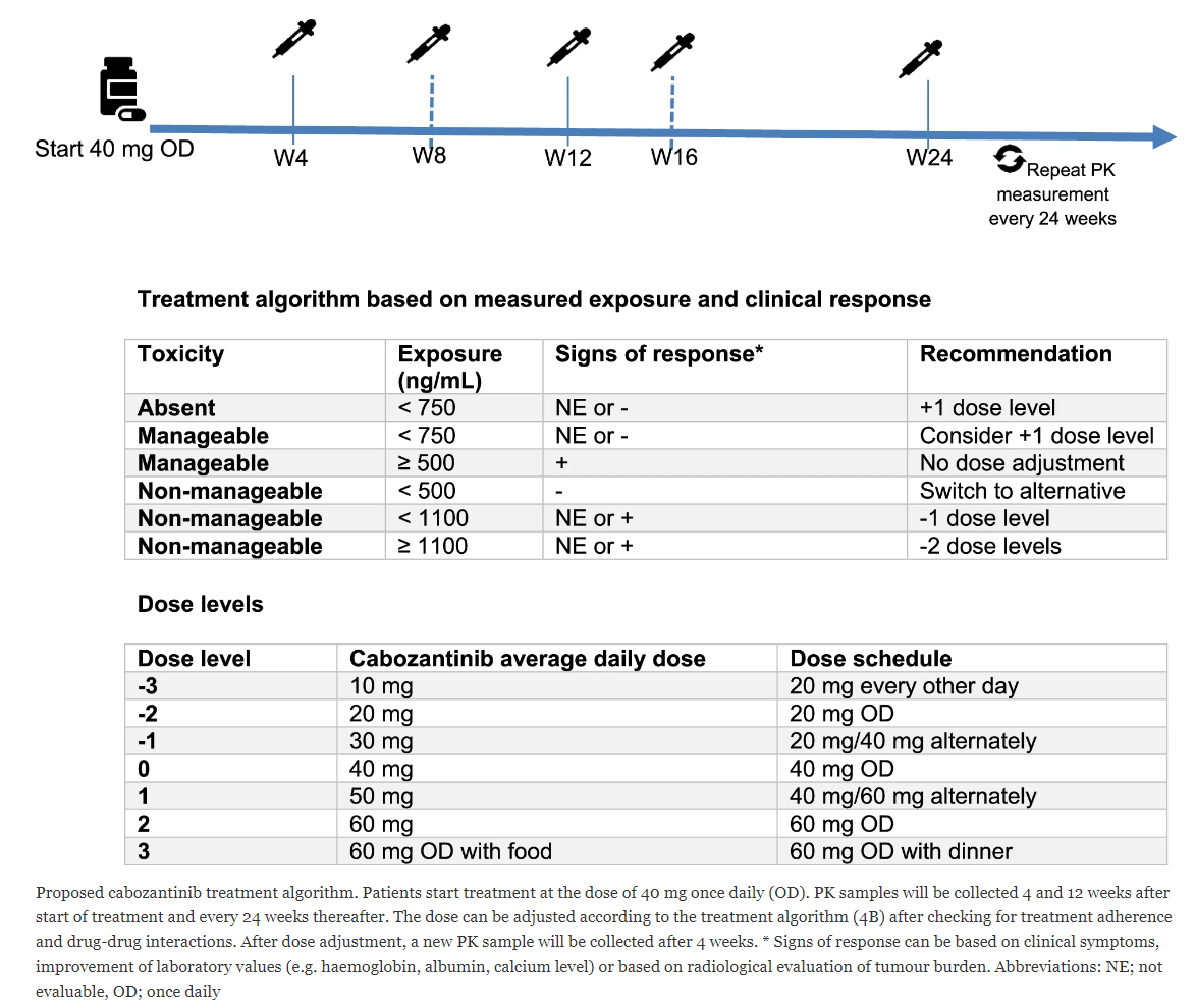 Gezien de lange halfwaardetijd van cabozantinib is het advies om pas na 4 weken gebruik van een constante dosering een dalspiegel af te nemen [1]. - Verzendcondities