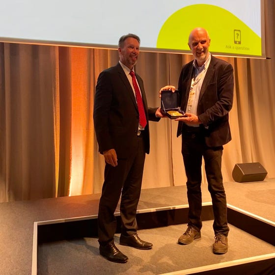 Prof.dr.ir. Jan Lagendijk krijgt de Klaas Breur Award uitgereikt tijden het ESTRO-congres in Kopenhagen, 9 mei 2022.