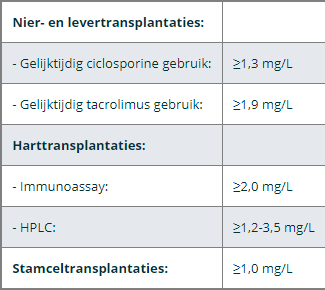 Nier/lever/harttransplantaties: 30-60 mg*uur/L eerste 6 maanden