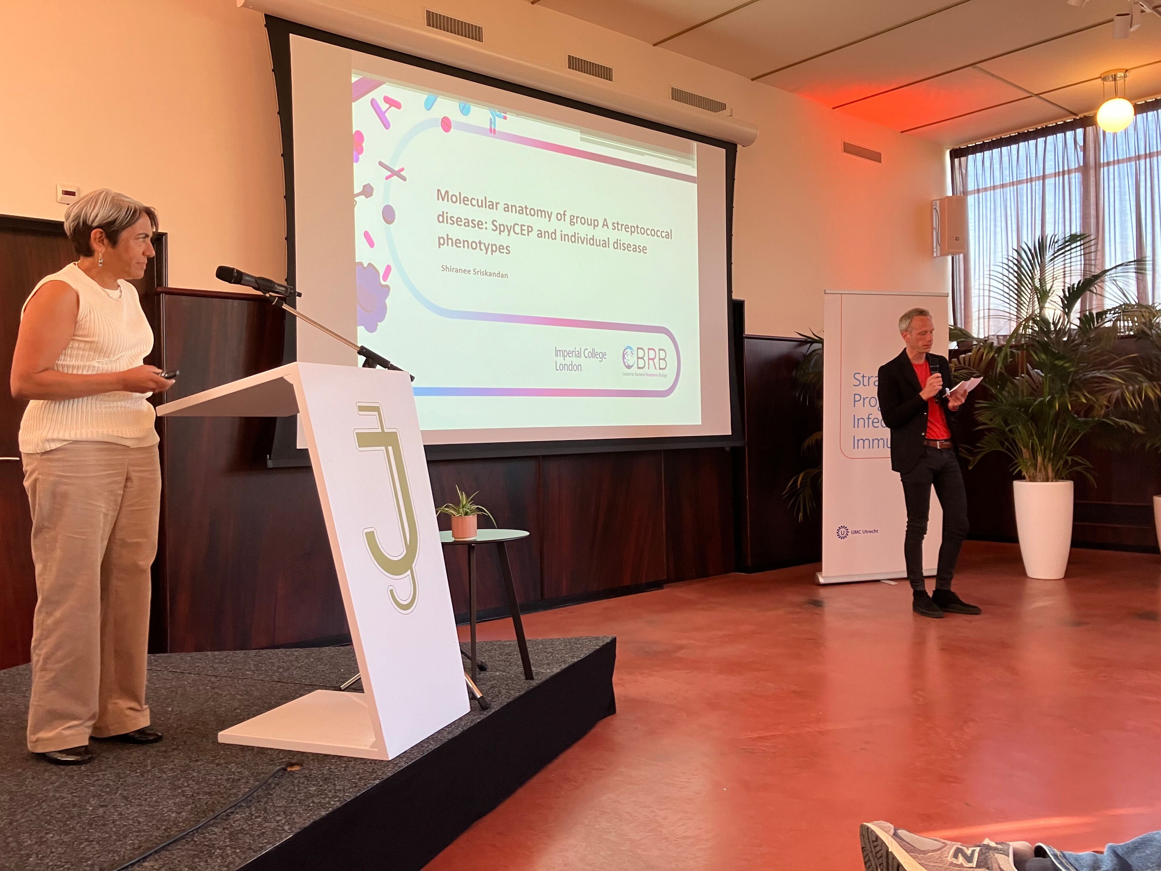 The scientific program ended with an impressive keynote lecture by Shiranee Sriskandan, professor of Infectious Diseases (Imperial College London, U.K.) entitled “On the molecular anatomy of group A streptococcal disease”. Prof. Sriskandan focuses her research on understanding the pathogenic mechanisms of Gram-positive bacteria, particularly Streptococcus pyogenes. This bacterium causes tonsillitis and scarlet fever, but also invasive infections such as necrotizing fasciitis, sepsis and toxic shock. Despite its significant health burden, there is currently no vaccine available. Research in Sriskandan’s group is mainly driven by unexpected changes that are seen in either the bacteria, patient disease phenotype, or disease epidemiology. This has led to work on novel proteases that cleave chemokines, that might function as vaccine targets, as well as unexpected routes of bacterial dissemination in the lymphatic system.