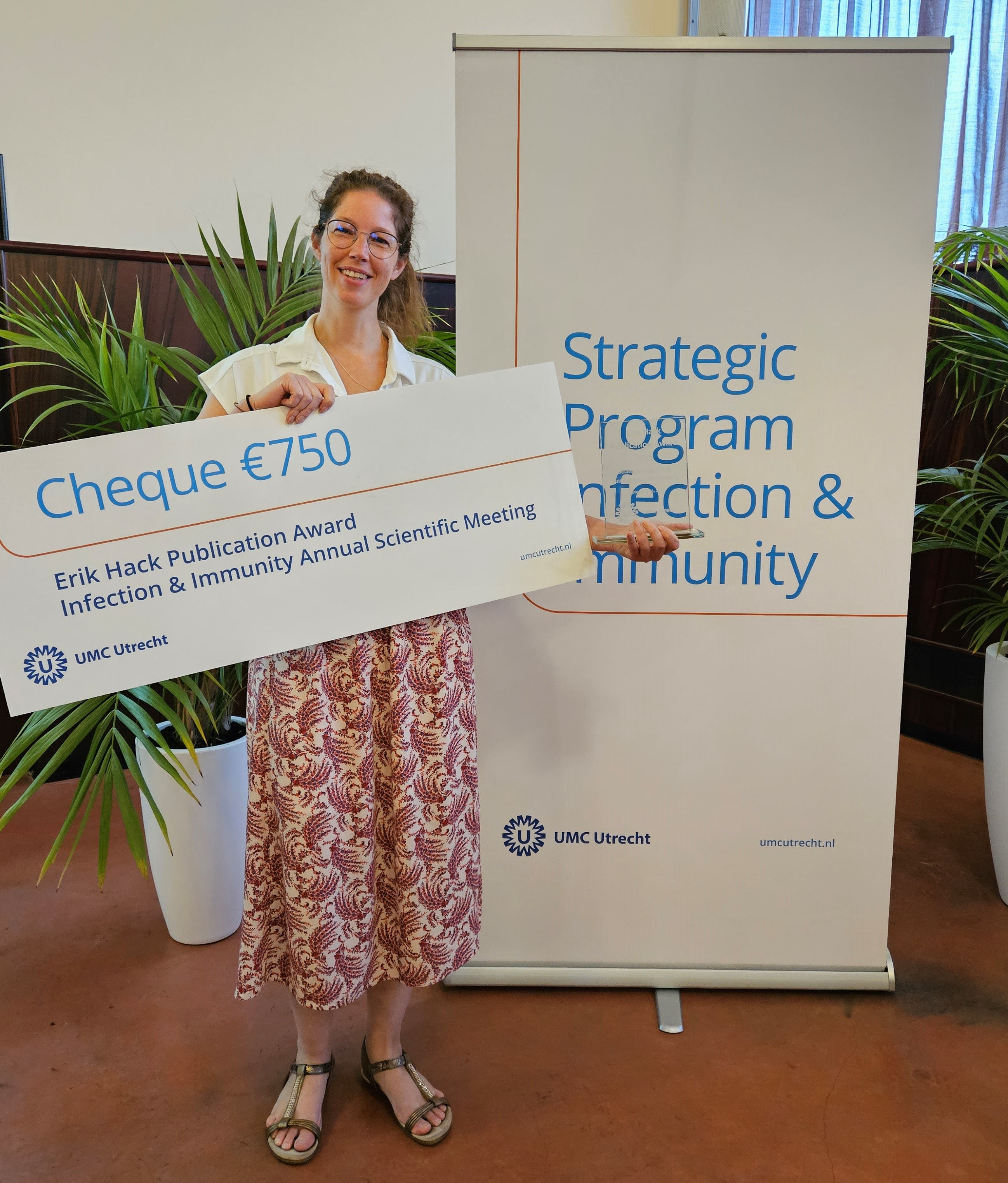 The strategic program I&I also held its pitch competition for the best I&I publication 2023 as first author by our PhD candidates. The award winner received 750 euro free to spend. Three candidates – Annelisa Cornel, Juana Claus and Thomas Kimman - were selected by an I&I reviewing committee to present their publication at the meeting. After live audience voting, the award was won by Annelisa Cornel (CTI and PMC) for her 2022 paper in Journal of Immunotherapy and Cancer entitled “Epigenetic modulation of neuroblastoma enhances T cell and NK cell immunogenicity by inducing a tumor-cell lineage switch.” Due to Annelisa’s absence (with her Rubicon fellowship, she is currently working on new treatments for neuroblastoma at Memorial Sloan Kettering Cancer Center in New York) the award was accepted by her colleague Joyce Meesters (PhD student at the PMC).