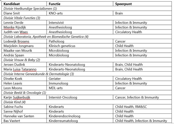 The first batch of clinical scientists at UMC Utrecht consists of eighteen colleagues (thirteen women and five men) from seven divisions and five strategic programs (see table). The candidates for the regenerative medicine & stem cells spearhead will be nominated early next year. The intention is to appoint more clinical scientists in the coming years.