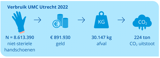 Een van de thema’s van de Green Deal Duurzame zorg is circulariteit. Dat betekent dat we proberen materialen opnieuw te gebruiken waar mogelijk. We kijken bijvoorbeeld naar een duurzamer gebruik van plastic verpakkingen, verpleegkundige en (steriele) medische materialen en hulpmiddelen zoals bloeddrukbanden en OK-jassen. En dan verspilling: in het UMC Utrecht worden op jaarbasis ruim 8 miljoen niet-steriele blauwe handschoenen gebruikt. En vaak zelfs onnodig! Dit kan anders en minder: naast duurzaamheidswinst is hier ook een enorme infectiepreventie en financiële winst te behalen.