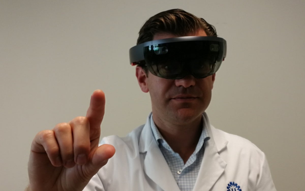 Een hologram is een driedimensionale afbeelding die bijvoorbeeld kan worden vertoond via een 3D-bril, tablet of smartphone. Neurochirurg in het UMC Utrecht Tristan van Doormaal en zijn team werken aan deze 3D-technieken om hersenoperaties beter te kunnen voorbereiden en uit te voeren. Tristan: “Met een hologram tijdens een operatie via een 3D-bril, gelinkt met het hoofd van de patiënt, kunnen we uiteindelijk exacter navigeren en gevaren zien. Bijvoorbeeld waar precies een bloedvat achter een hersentumor zit of waar we een drain kunnen plaatsen, zonder belangrijke delen in de hersenen te raken. Dit maakt operaties veiliger en sneller en dus minder belastend voor patiënten.”