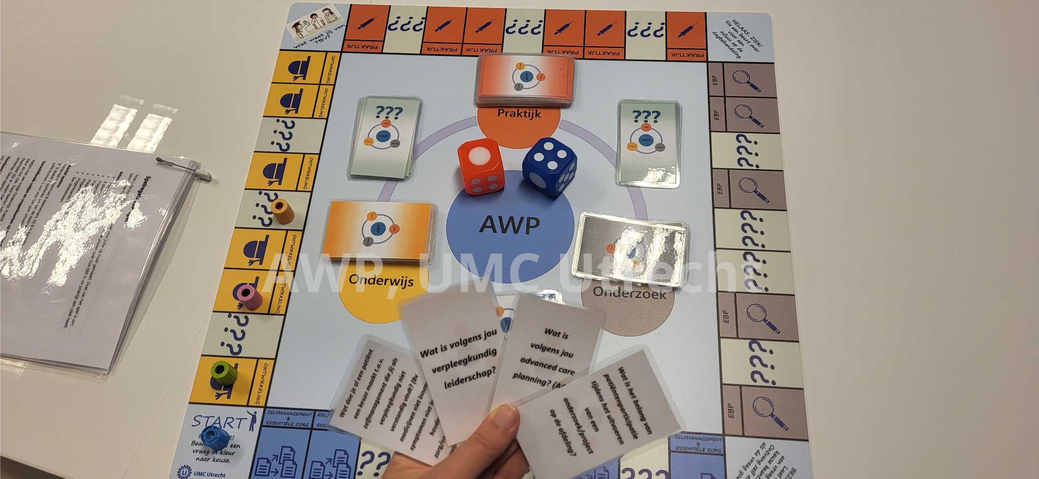 Het EBP spel is gebaseerd op het bekende monopoly spel maar dan gefocust op Evidence Based practice in de praktijk. Het spel zorgt ervoor dat je op een speelse manier meer leert over hoe je EBP in de verpleegkundige praktijk kan inzetten. Daarnaast zijn er ook nog vragen die gaan over je eigen professionalisering, zelfmanagement, essentiële zorg en bevat het ook afdelingsgebonden vragen (zoals ziektebeelden).