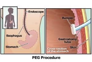 Als u langere tijd afhankelijk bent van sondevoeding, kan uw arts voorstellen een PEG- sonde (Percutane Endoscopische Gastrostomie) bij u te laten plaatsen. U krijgt dan vloeibare voeding en medicatie via de PEG-sonde direct in de maag toegediend.