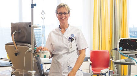 “Ik leg bij patiënten een infuus aan en dien medicatie toe.” Marian Scheepers is oncologieverpleegkundige op de dagbehandeling medische oncologie. Samen met haar collega’s heeft ze de zorg voor patiënten die wekelijks tot driewekelijks komen voor een behandeling. “Patiënten kunnen door de medicatie, zoals chemotherapie, klachten ervaren. Aan de hand van een klachtenlijst (Utrecht Symptoom Dagboek) bespreek ik met patiënten hoe ze zich voelen en geef advies over hoe ze met klachten kunnen omgaan. Het is waardevol om patiënten tijdens hun behandeling te ondersteunen en te begeleiden. We horen veel terug dat patiënten zich bij ons welkom en gehoord voelen. Het is bijzonder om daaraan bij te dragen.”