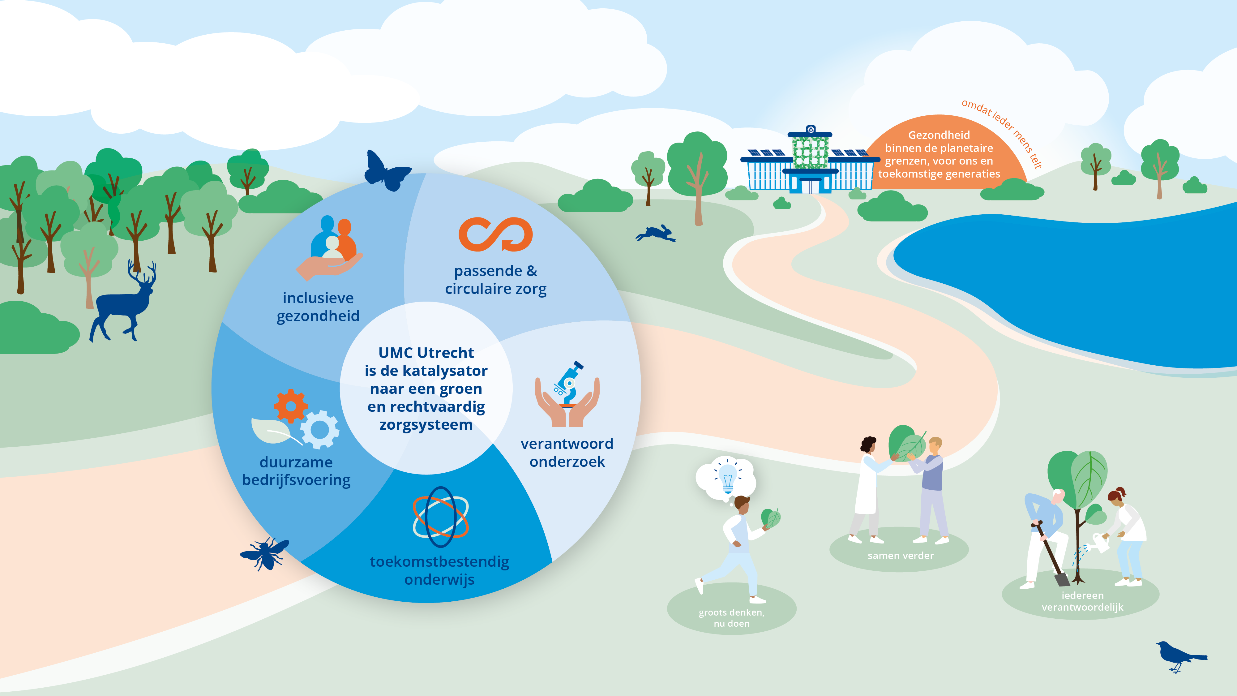 Het is tijd dat we gaan leven in balans met wat onze aarde ons biedt. Als UMC Utrecht nemen we onze verantwoordelijkheid richting de volgende generaties. We streven naar gezondheid binnen de planetaire grenzen. We willen méér doen dan onze eigen voetafdruk verkleinen. We willen de beweging aanjagen, het systeem veranderen.