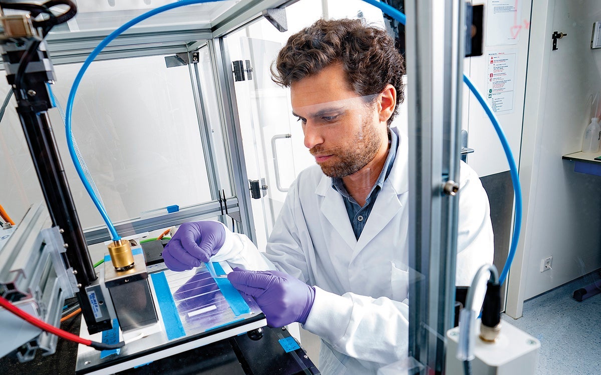 Een 3d-printer die van biologisch afbreekbaar materiaal zulke kleine vezels maakt, dat onderzoekers daarmee pleisters kunnen maken om het hart te repareren.