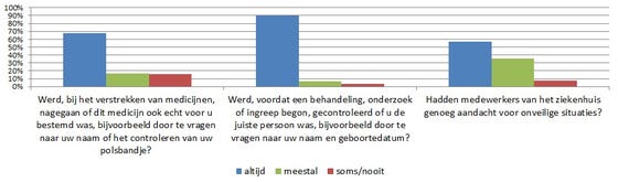 • Bij negentig procent van de patiënten wordt, voordat een behandeling, onderzoek of ingreep begint, gecontroleerd of de patiënt de juiste persoon is. Bij zeven procent gebeurt deze controle meestal en bij drie procent soms of niet.