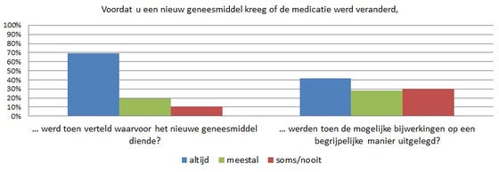 • Bij 68 procent van de patiënten die een nieuw geneesmiddel of verandering van medicatie hebben, wordt  altijd verteld waarvoor het nieuwe geneesmiddel dient. Bij 24 procent gebeurt dat meestal en bij acht procent van de patiënten wordt dit soms of nooit verteld.