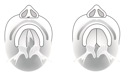 Onderaanzicht van links een volledige spleet en rechts een spleet van alleen het zachte gehemelte