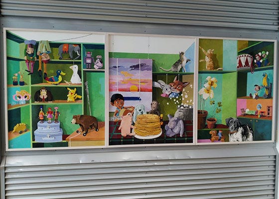 Kunstenaar Erik: “De opdracht om iets te maken voor een kinderziekenhuis, vond ik een mooie vraag. Kunst kan ook een beetje helpen denk ik, om het verblijf íets aangenamer te laten zijn. Zeker in het Wilhelmina Kinderziekenhuis. Kunst kan je even op andere gedachten brengen. En dat is fijn. De plek, de ingang naar de verpleegafdeling, deed me meteen denken aan een marktkraam, of aan een etalage. Dat metaal, boven en beneden, leek wel een rolluik. Daarom dacht ik een grote schildering te gaan maken met allemaal dingen die daar thuishoren. Die je er - bij wijze van spreken - zou kunnen kopen. Maar wélke dingen, welke spullen?”