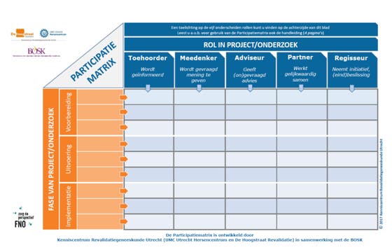 De Participatiematrix is een middel voor projectleiders / onderzoekers waarmee zij met patiënten het gesprek aangaan over de gewenste rol in een (onderzoeks)project. De Participatiematrix is ook een middel voor patiënten om te laten zien welke rol zij wensen te spelen. Projectleiders kunnen hierdoor: