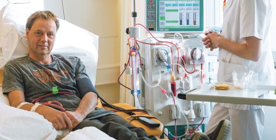 Wachten tot er een geschikte donornier is... Tot die tijd komt Pieter Smit (44) driemaal per week in het UMC Utrecht voor nierdialyse. Dat is noodzakelijk om afvalstoffen uit zijn bloed te halen.