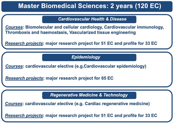 Through your choice of one of the master's programs from the Biomedical Sciences education you can further develop yourself in the cardiovascular field. For example, if you are interested in the (molecular) basis and treatment of cardiovascular diseases, then the master’s program Cardiovascular Health & Disease is an excellent choice. If you are more into epidemiological approaches to different diseases, then the Epidemiology master's program is an obvious choice. Fascinated by the possibility of repairing failing body parts with stem cells or cultured body cells? Then find out about all the possibilities within the Regenerative Medicine and Technology master's program. Within these three master's programs, there is ample opportunity to further expand your knowledge and expertise in the cardiovascular field by choosing specific courses and research projects. Numerous studies are underway within the Circulatory Health Research Center, both in the clinic and in the laboratory, which make use of expertise from these different research disciplines.