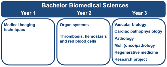 In "Medical imaging techniques" (year 1) you can learn about different imaging techniques and their applications. The "Organ Systems" elective course from year 2 provides you with general knowledge about the structure and function of the cardiovascular system and introduces you to a number of cardiovascular diseases. During "Thrombosis, hemostasis and red blood cells" (year 2) the latest developments in hemostasis and thrombosis are discussed. In year 3, various recent aspects of cardiovascular diseases are extensively discussed in the elective courses "Cardiac pathophysiology", "Vascular biology", "Pathology", "Molecular (onco)pathology" and "Regenerative medicine". You can gain experience with cardiovascular research during the "Research project". It is certainly possible to follow a cardiovascular “profile” within the bachelor program according to your own interests.
