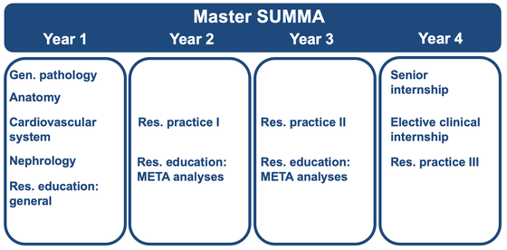 For biomedical and life sciences bachelors, the SUMMA in Utrecht is a challenging master's program to become a basic physician ánd clinical researcher. During this program you learn the general skills necessary for scientific research in the line "Research education". In addition, the SUMMA training program pays attention to various medical disciplines, including cardiovascular diseases. For example, blood circulation and the most common circulatory disorders are addressed in different ways in the first year (courses "General Pathology", "Anatomy", "Cardiovascular System" and "Nephrology"). In addition, you will gain clinical experience with cardiovascular patients during various student outpatient clinics under the supervision of medical specialists. If you are interested in cardiovascular research, there are excellent opportunities within the Circulatory Health Research Center for further depth through clinical internships and a research project ("Research Practice") during SUMMA training.