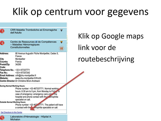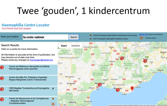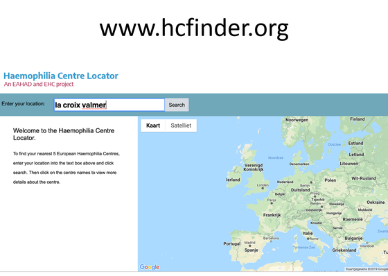 De dichtstbijzijnde hemofiliebehandelcentra in Nederland en in het buitenland zijn te vinden via de link ‘Hemofiliebehandelcentra wereldwijd’ op de homepage van de Van Creveldkliniek. Een voorbeeld hiervan is www.hcfinder.org die leidt naar de Haemophilia Centre Locator voor Europa en bijvoorbeeld ook Canada. In deze centra hebben ze ook verstand van andere stollingsstoornissen en meestal ook van de andere bloedziekten.