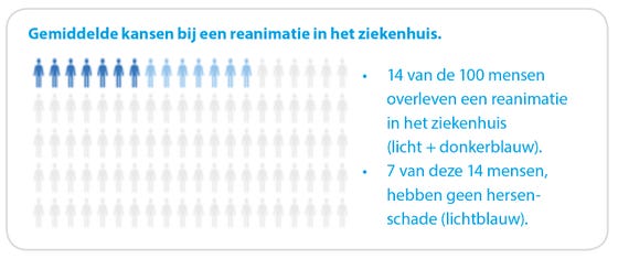 - 14 van de 100 mensen overleven een reanimatie in het ziekenhuis (licht + donkerblauw).