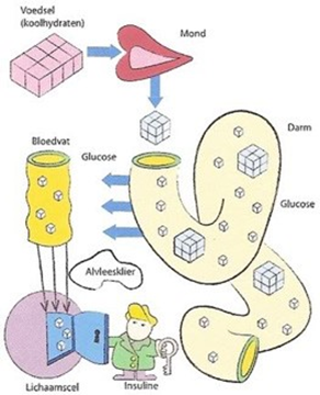 Afbeelding 1: In deze afbeelding wordt weergegeven hoe insuline de sleutel is om glucose vanuit het bloed op te kunnen nemen in de lichaamscel.