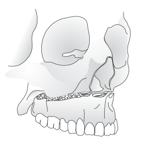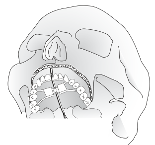 Soms past men een andere operatiemethode toe. De botsnede wordt net voor het gewricht recht naar beneden gelegd. In figuur 2 ziet u hoe dit gedaan wordt. Het achterste deel, waar het kaakgewricht aanzit, wordt naar buiten gehouden en het voorste deel van de kaak met tanden en kiezen wordt naar achteren verplaatst. De botstukken overlappen dan gedeeltelijk. Nadat het kaakdeel naar achteren is verplaatst, worden de botstukken met staaldraadjes aan elkaar vast-gemaakt. Dit gebeurt voor een periode van zes weken. Na de operatie aan de onderkaak kunt u tijdelijk een wat vreemd gevoel in het gebied van de onderlip en kin hebben, dat enkele weken kan duren. De bewegingen van de onderlip blijven normaal.