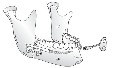 Soms is het beter de onderkaak geleidelijk te verlengen. Hiervoor wordt een apparaatje in de onderkaak aangebracht dat via een schroefsysteem verlengd wordt. Het apparaatje zit onder het tandvlees en steekt er aan de voorzijde uit. Daarna worden de botsnedes gelegd zoals u kunt zien in figuur 3. De eerste week na de operatie geneest de wond en wordt de kaak nog niet verlengd. De week daarna wordt de kaak langzaam verlengd door met een klein sleuteltje aan het apparaatje te draaien, totdat de juiste positie van de kaak bereikt is. Dit draaien aan het apparaatje doet u zelf. Voor een goede begeleiding komt u twee tot drie maal per week naar de polikliniek. Na één tot twee weken is de kaak voldoende verlengd. Er vormt zich nieuw bot op de plek waar de botsnede is aangebracht. Het apparaatje wordt na twee tot vier maanden op de dagbehandeling verwijderd.