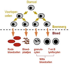 Bloed wordt gevormd in het beenmerg. In het beenmerg bevinden zich stamcellen of voorlopercellen. Door deling en rijping ontstaan uit deze stamcellen de rode en witte bloedcellen en de bloedplaatjes. Per dag worden vele miljoenen cellen aangemaakt om het aantal bloedcellen op peil te houden. Rijpe bloedcellen verlaten het beenmerg en komen in de bloedbaan terecht.