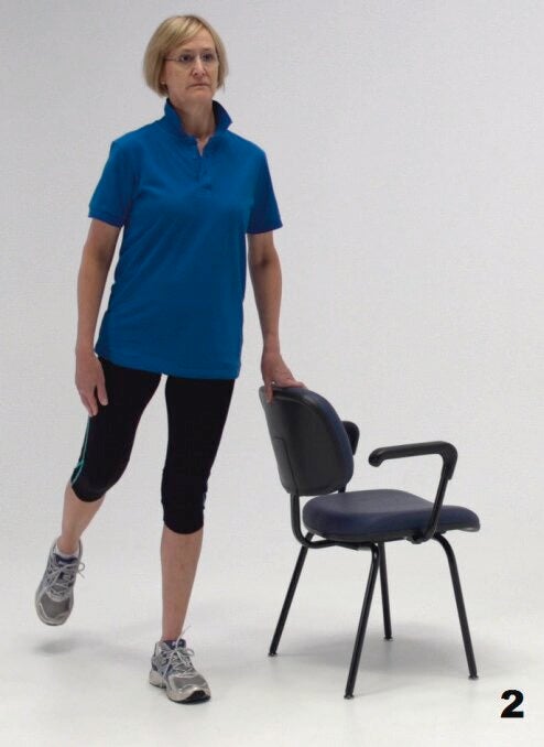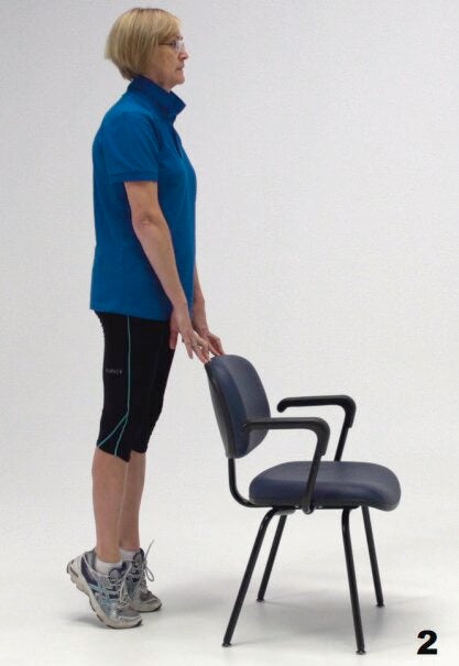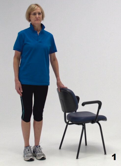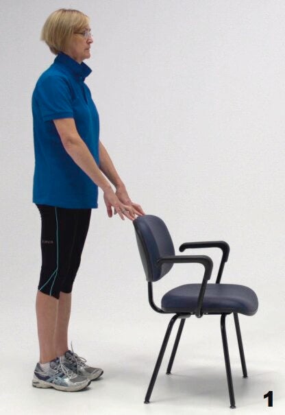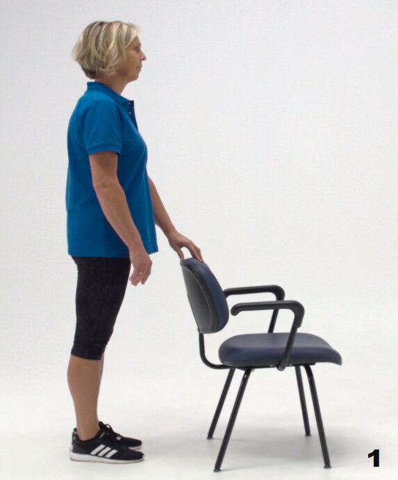 - Buig rustig door de knieën, alsof u wilt gaan zitten maar zorg dat u de stoel net niet raakt.