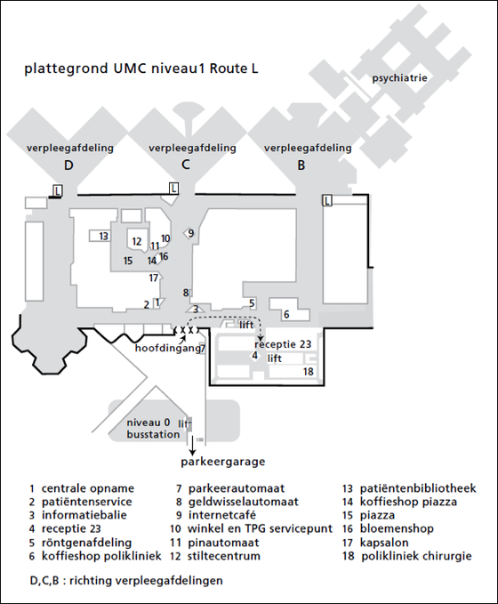 Hieronder vindt u een plattegrond van UMC. Voor meer informatie kunt u ook terecht bij de receptie bij de hoofdingang.
