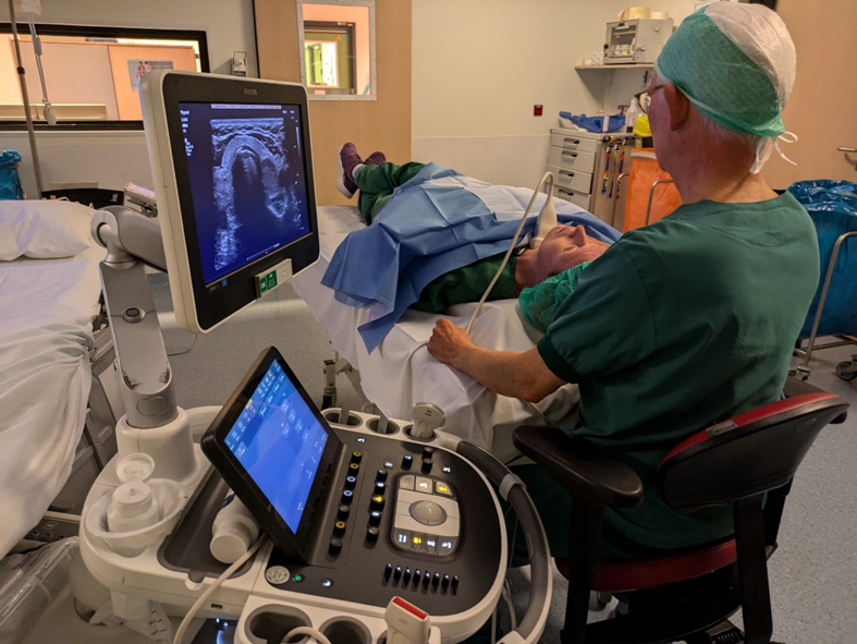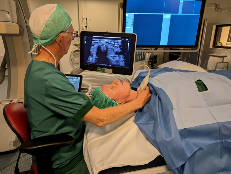 Voor de behandeling komt u op een onderzoekstafel te liggen met het hoofd iets achterover. De radioloog die de behandeling uitvoert zit achter u (zie afbeelding hieronder). Op elk been wordt een aardingspad (een soort grote plakker) aangebracht. Met echografie zal de radioloog de exacte plaats en het volume van de schildkliernodus bepalen.