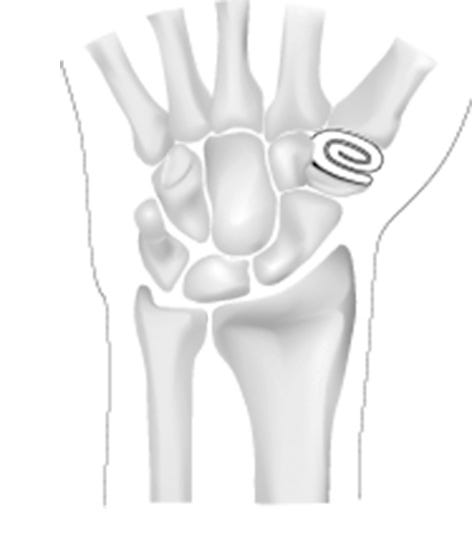 De plastisch chirurg maakt een lengte snee over het polsgewricht en verwijdert dan de eerste rij polsbotjes (zie tekening). Hierna wordt de wond gehecht en een spalk aangelegd voor vier weken.