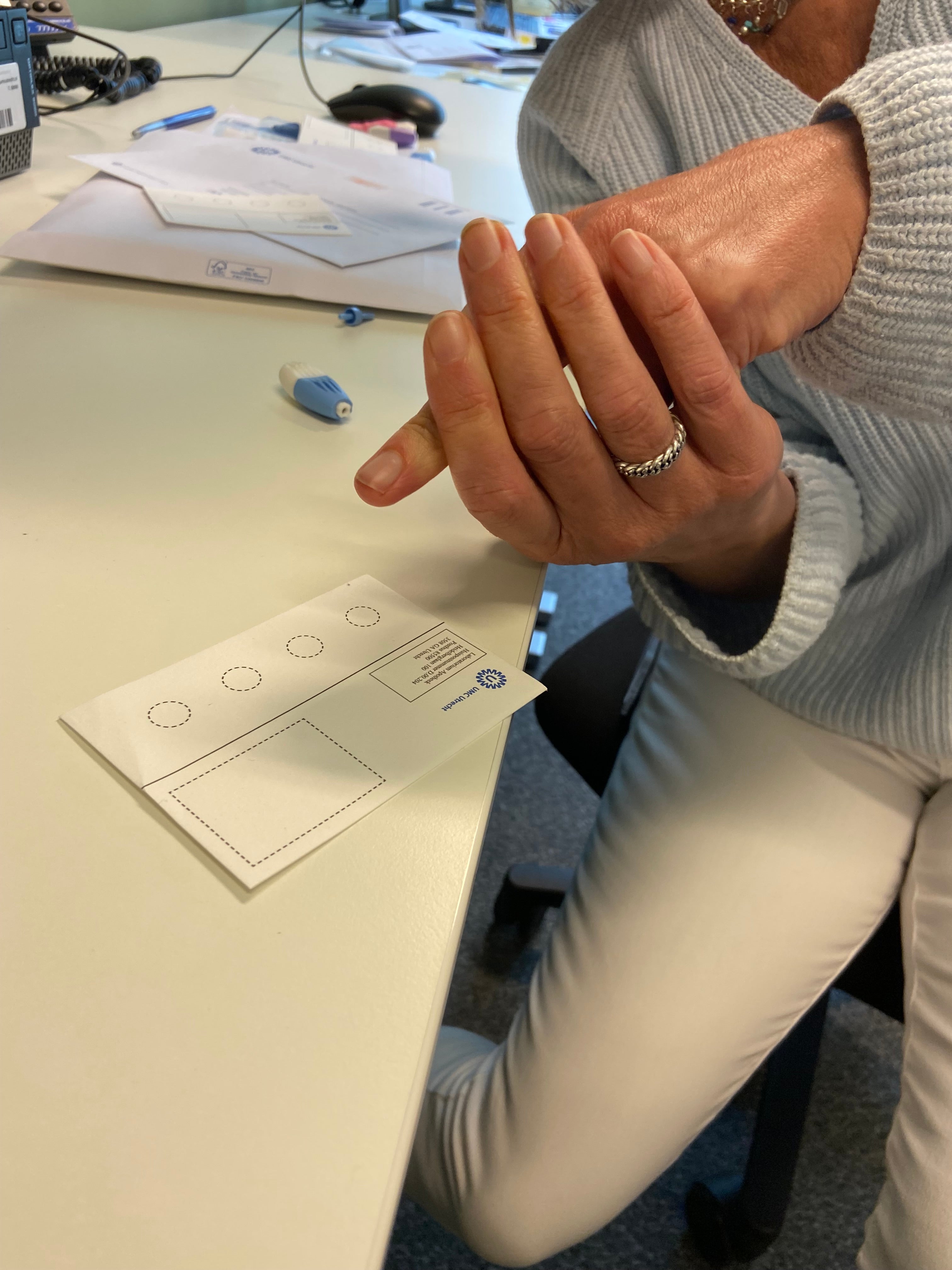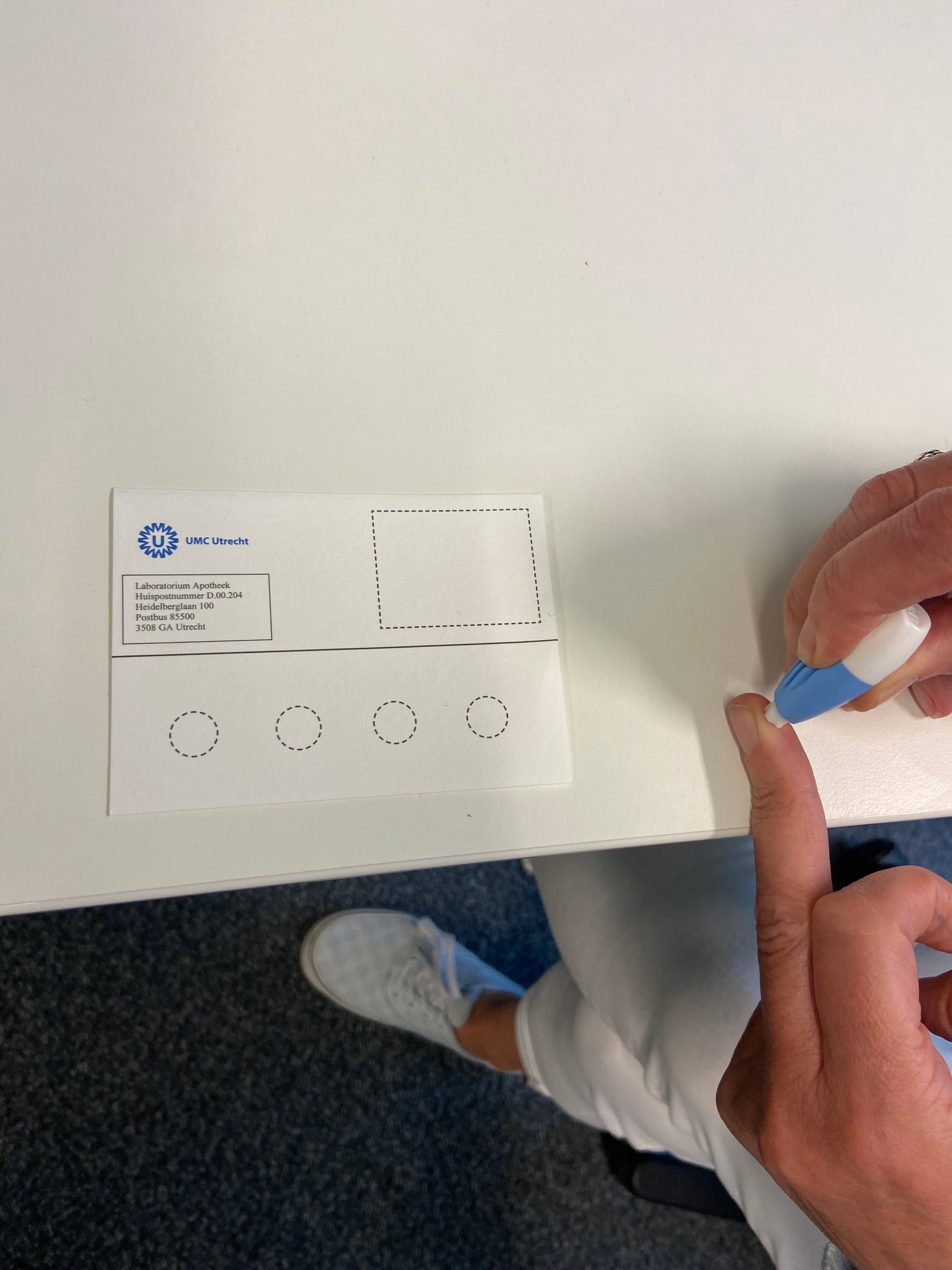 Doe het plastic zakje met bloedspotkaartje in de antwoordenvelop.