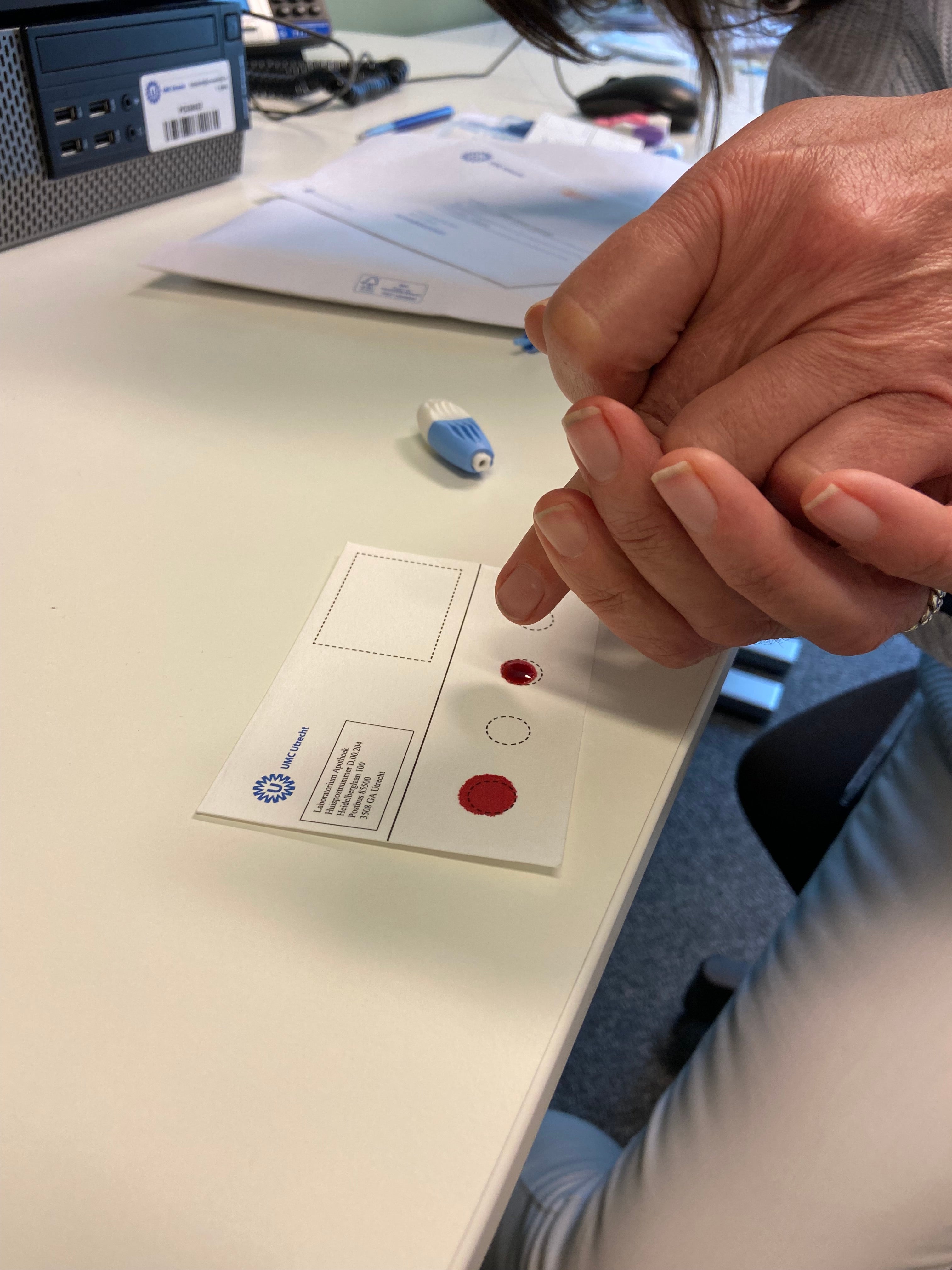 Setjes voor de bloedspots (laboratorium formulieren, prikpennen, enveloppen, kaartjes voor de bloedspots) kunt u aanvragen via een e-consult, of via het secretariaat van de harttransplantatie.