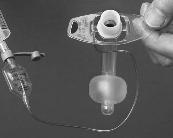 De meeste tracheacanules hebben aan het uiteinde een cuff (=ballonnetje). Het ballonnetje is niet zichtbaar wanneer de canule ingebracht is. Het systeem om het ballonnetje op te blazen wel.