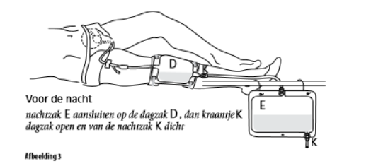 De nachtzak kan aan de dagzak gekoppeld worden. Zet dan het kraantje van de dagzak open en dat van de nachtzak dicht (zie afbeelding 3). De beenbanden kan u ’s nachts eventueel afdoen.
