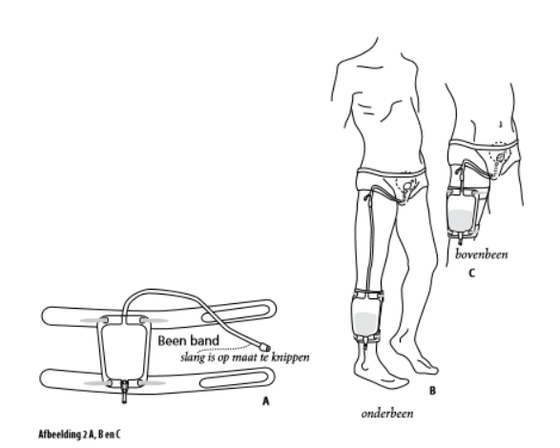 De beenzak wordt meestal op het boven of onderbeen gedragen. Om de zak te bevestigen zijn er twee mogelijkheden, namelijk met beenbandjes en met een beenzakhouder (zie afbeelding 2 A, B en C). De beenzak heeft een inhoud van 500 ml en kan aan de onderkant geleegd worden in het toilet (zie verder gebruiksaanwijzing).