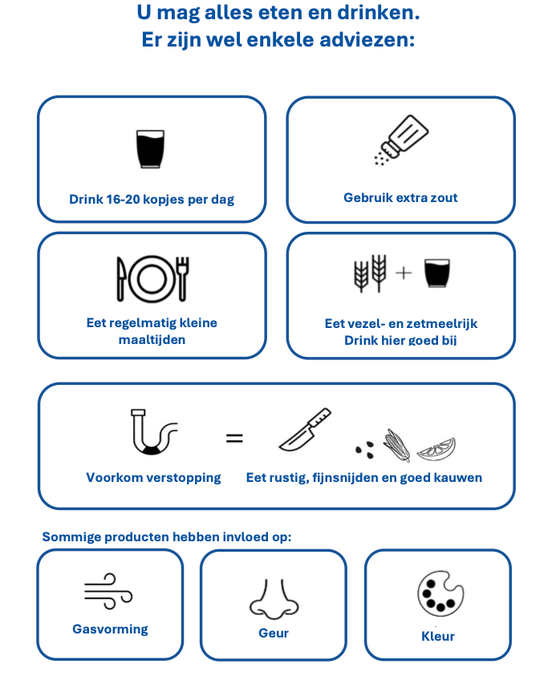 Indien dit met gewoon eten niet lukt, kunt u extra O.R.S. (Oral Rehydration Salts) gebruiken om tekorten te voorkomen. O.R.S. bestaat uit o.a. water, suiker en zout. Het is verkrijgbaar bij apotheek en drogist. Neem contact op met uw arts of diëtist bij vragen over het gebruik van O.R.S..
