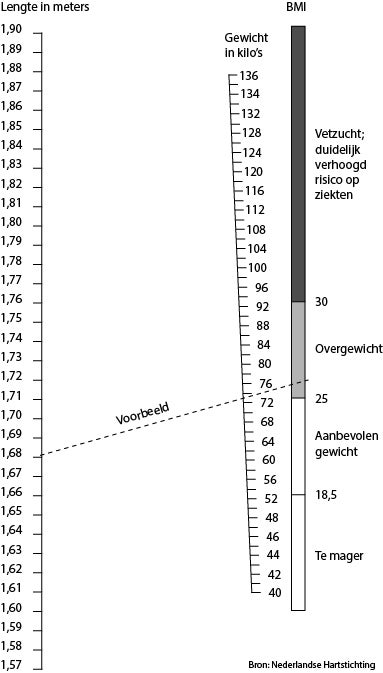 Aan de linkerkant zoekt u uw lengte, aan de rechterkant uw gewicht. Deze punten verbindt u met een lijn en trekt deze door naar de meest rechter kolom. Daar kunt u zien of u een goed gewicht of overgewicht hebt.