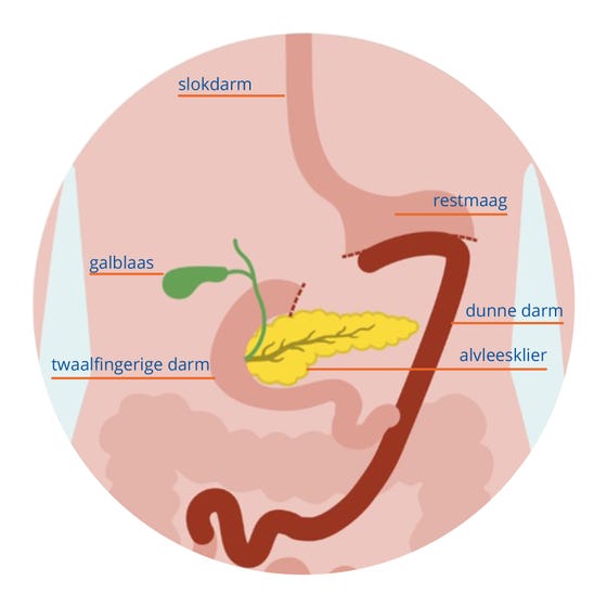 Bij de operatie is een gedeelte van de maag verwijderd. Meestal wordt het onderste deel van de maag verwijderd en wordt ook de kringspier aan de onderzijde van de maag (= pylorus) weggehaald. De restmaag wordt vervolgens aangesloten op de dunne darm.