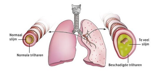 - ook zeldzamere afwijkingen als taaislijmziekte (cystic fibrose) of een probleem in de werking van de trilhaartjes (PCD) kunnen een oorzaak zijn voor het ontstaan van bronchiëctasieën